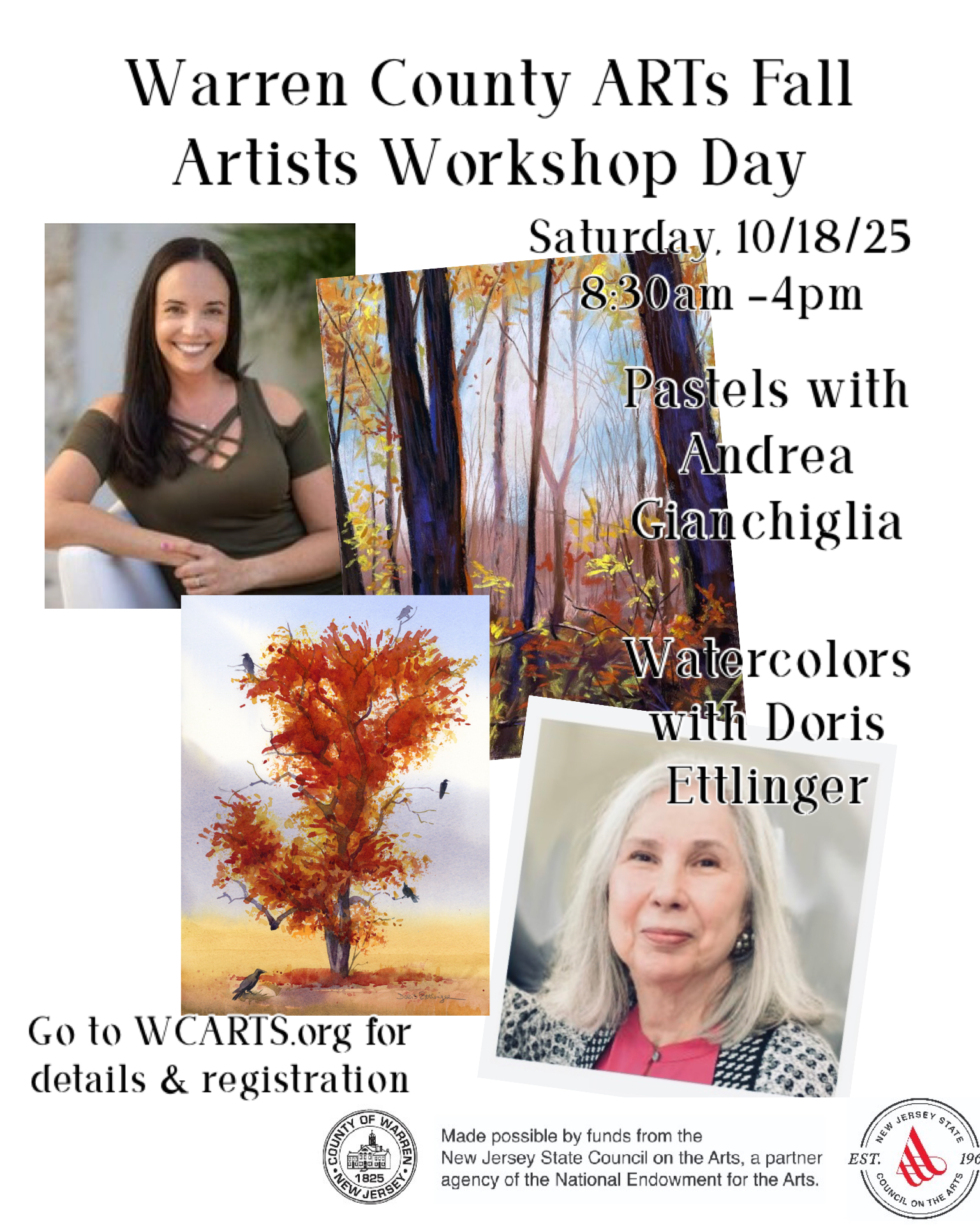 Join Warren County ARTS on Saturday, October 18th, 8:30am - 4pm for our Fall Artist Workshop Day held atSaint Peter & Paul Church, 360 US Hwy 46, Great Meadows, NJ. Members $90, Non-members $130. All materials provided. Beginners or experienced, adults 18+ yrs. Class size limit=20. Pre-registration required by Oct 11th.